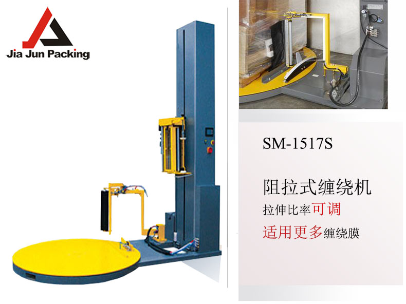 阻拉式纏繞機(jī)是指通過(guò)調(diào)節(jié)阻拉伸機(jī)構(gòu)的摩擦阻尼,使纏繞膜被動(dòng)拉出時(shí)的速度慢于托盤貨物轉(zhuǎn)動(dòng)的速度,進(jìn)而在纏繞膜被拉開(kāi)的同時(shí)裹繞到貨物之上的纏繞膜包裝機(jī)。因?yàn)榭梢詫⒆枘嵴{(diào)節(jié)為“零”,所以任何品質(zhì)的纏繞膜或普通塑料膜均可以使用。為了增強(qiáng)纏繞包裝的穩(wěn)定性,在包裝尺寸范圍內(nèi)使用。