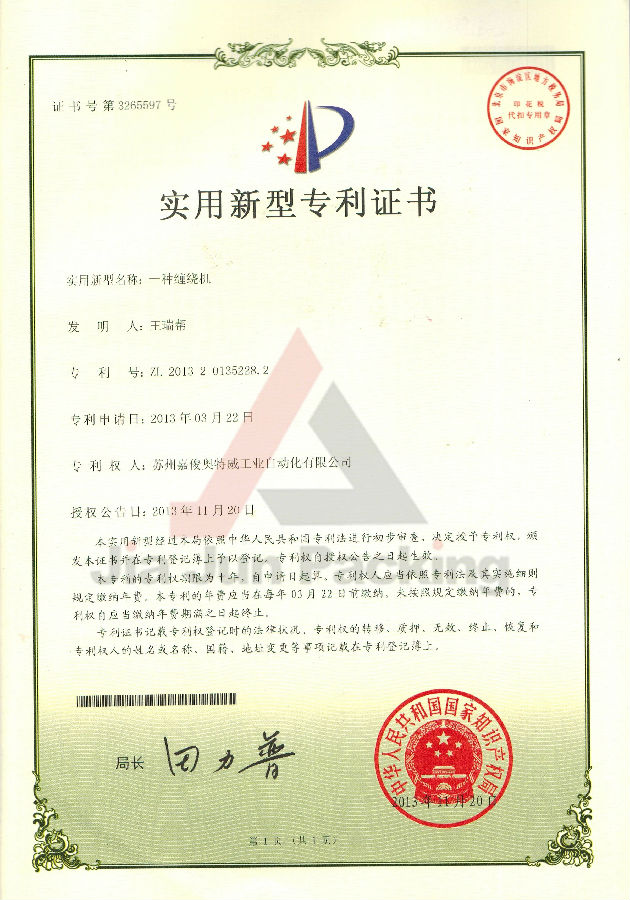 纏繞機(jī)專(zhuān)利證書(shū)